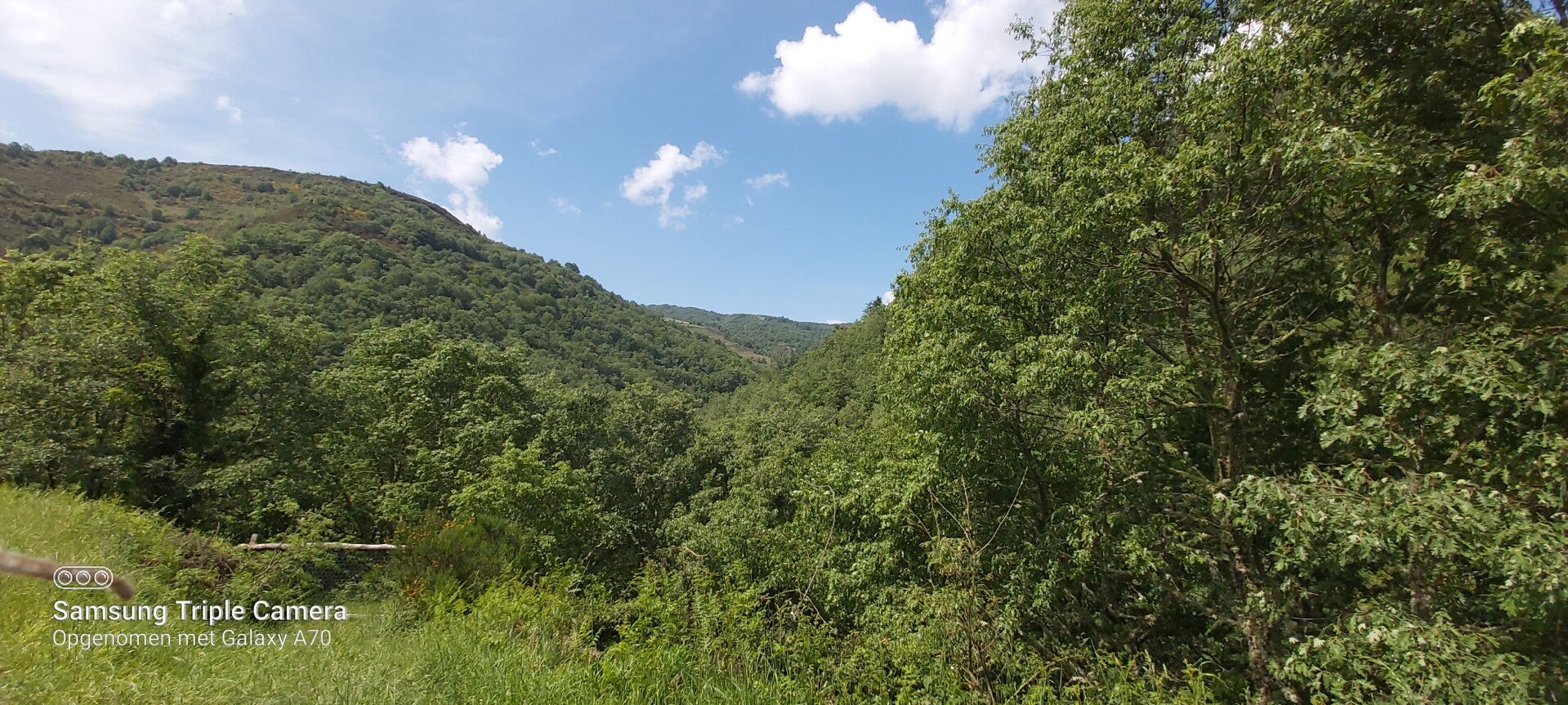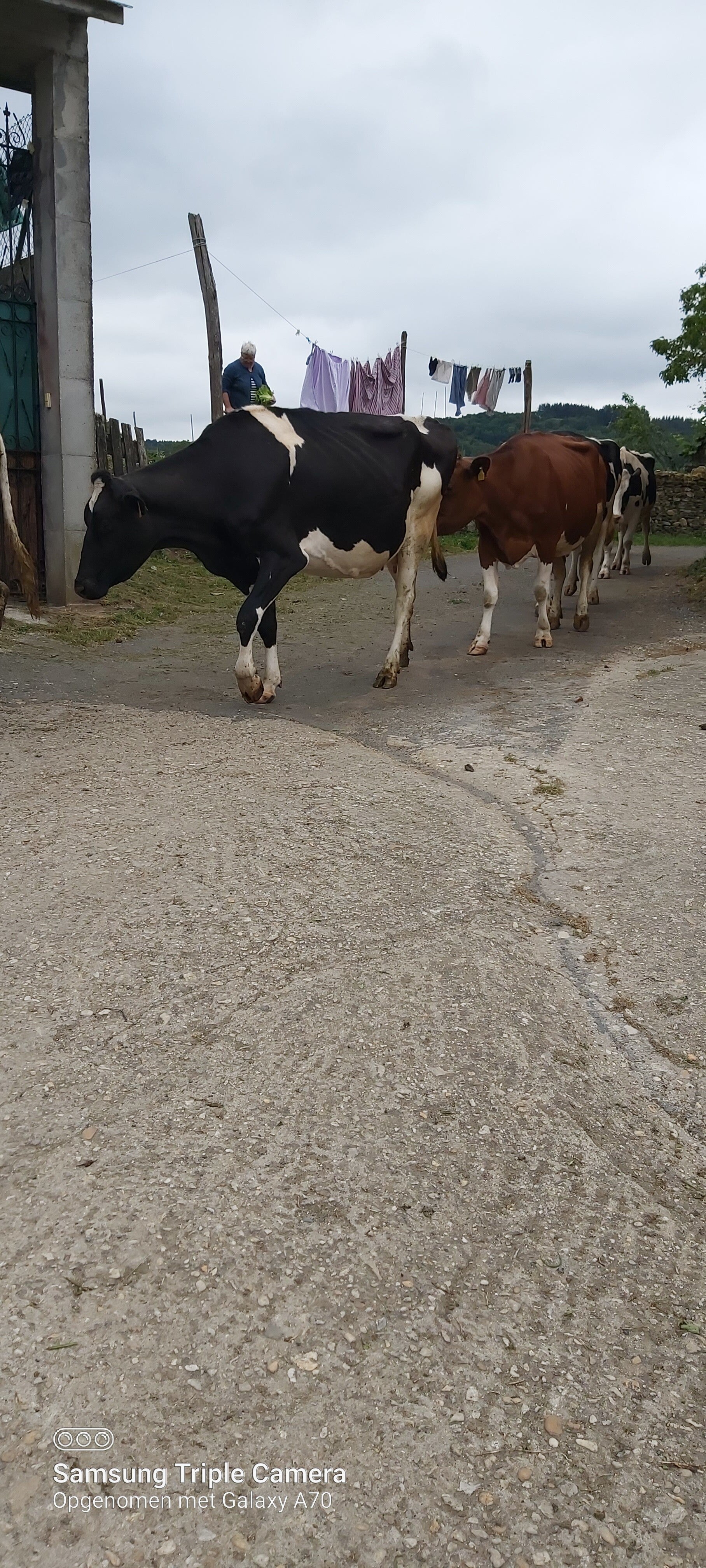 10.30. We zijn al anderhalf uur aan het rijden. Ik kijk wat in het ronde. Natuur, bossen, heuvels, een grindweg iets verder op die tussen weiden kronkelt...en Pelgrims die erop hun Tocht naar Compostella aan het voortzetten zijn. Deze komen vanuit Portugal dus. We hebben ongeveer 100km gereden. Zij zullen dus ongeveer in 3 à 4 dagen aankomen... ULTREÏA PEREGRINOS, ULTREÏA...