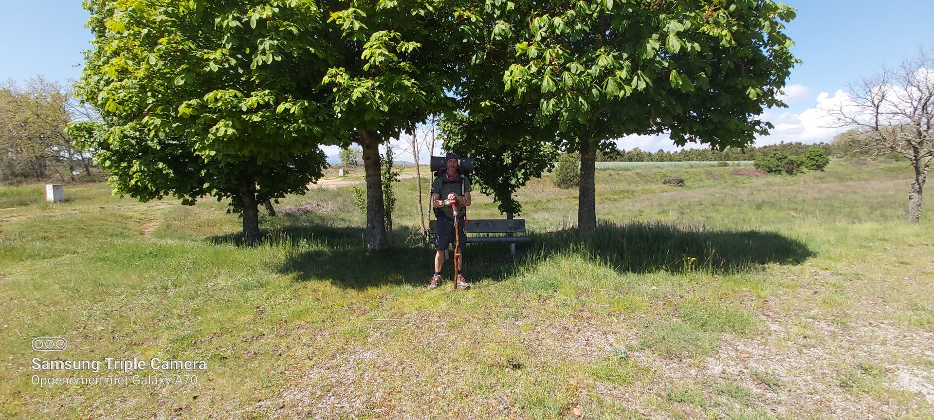 Vetrokken voir mijn dzg etappe. Nogal mistig en behoorlijk koud. Heb mijn jas én fleece aan. Dat is van lang geleden dat ik het nog beiden nodig had in de ochtend. Mijn zak weegt dus alweer wat minder. Ik heb nog maar een dik 2 kilometers gewandeld dat er aan mijn linkse kant een bar/teras is. Ik hen stempels nodig en kan wel nog een wc gebruiken ook. Ik ga er een halte nemen. Daar ontmoet ik er een koppeltje die ik een paar dagen geleden had gezien. Zij waren het die deze foto van me nam: