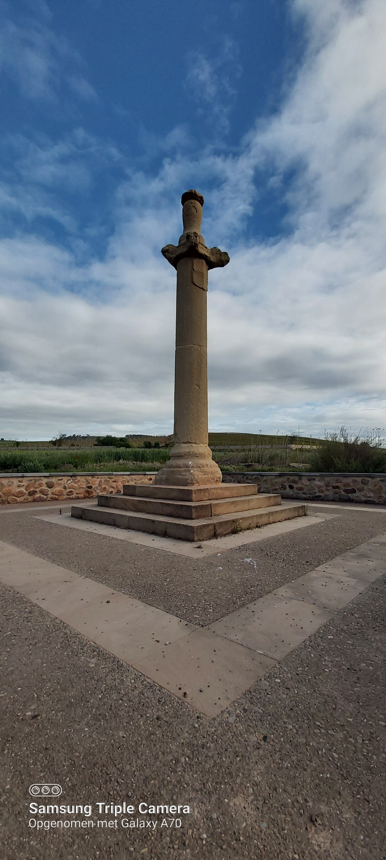Men Tocht verloopt voor de rest iets wat moeilijker. Ik ben al een tijdje op een flauwe helling die maar blijft duren. Het is puffen en zweten al valt er een licht regen. En het blijft maar stijgen. Eindelijk bereik ik het top ervan. Blijkt dat ik juist de Alto del Perdón heb bekijkt. Het panorama is grandioos. Ik neem enkele foto's en vergeet niet die ijzeren, zo bekende kunstwerken ook vast te leggen. Na een korte rust begin ik aan de afdaling. Op een weg aanwijzing staat er Uterga, 3.5 km 1h15 ? Ik loop gemiddeld 5.7km, toch tijdens men trainings in België, hier iets langzamer. Maar 1h15 voor 3.5 km dat betwijfel ik toch. Dus ga ik richting de afdaling. Op mijn linker kant zie ik nog een mini 'Stone Age' (Ik kom daar later op terug) waar ik al meerdere keren over gelezen had en besluit er naartoe te gaan om het ook op beelden vast te leggen. Dit geklaard nu richting afdaling.
