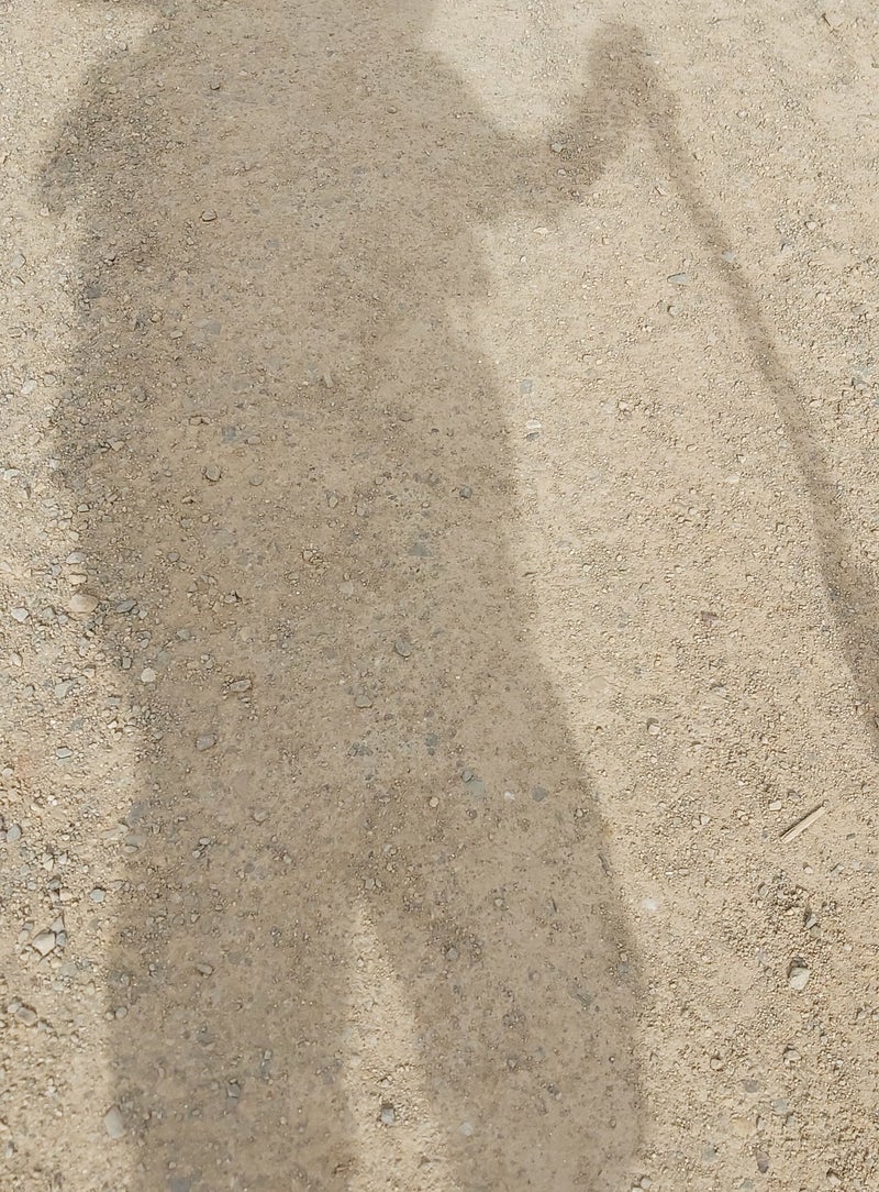 Warm, hoofdpijn, lastig met mezelf (fysieke en mentaal). Eerst keer dat ik twijfel over alles. Dorst en waarschijnlijk vocht tekort. Neem om het half uur pauze. Normaal drink ik 3 á 4 liter op een dag. Verlang naar volgende dorp...