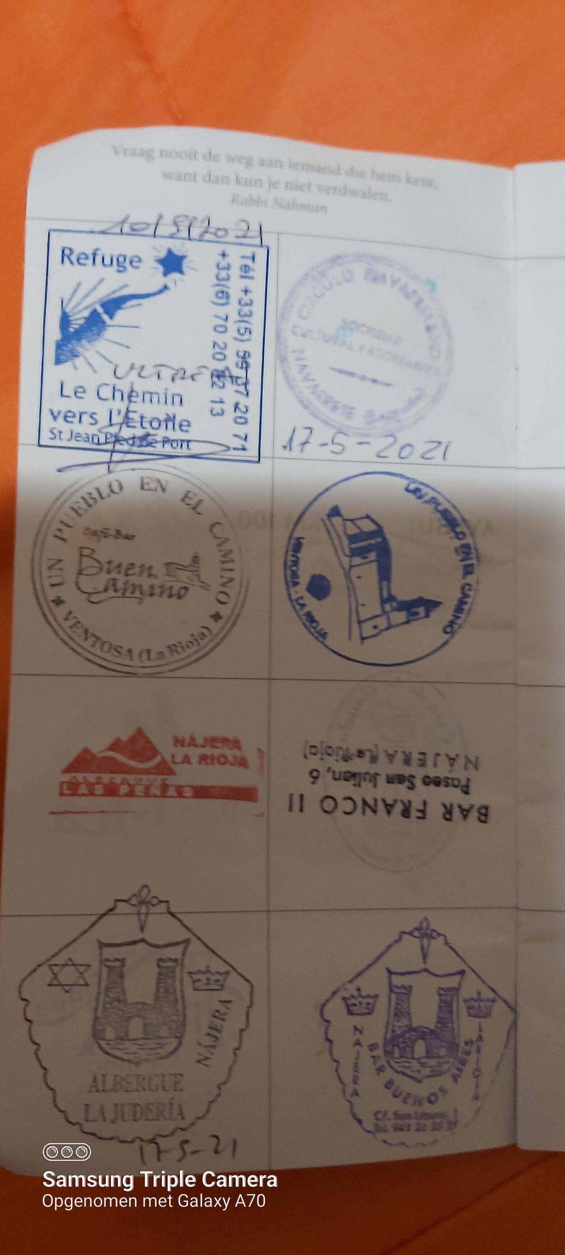 Terwijl ik deze text aan het schrijven ben heb ik een rust pauze genomen om wat de drukte van de Pelgrims voorbij te laten lopen. Ik vraag mijn stempel en kom zo op een nieuwe volle blad. De text op de volgende komt juist van pas: